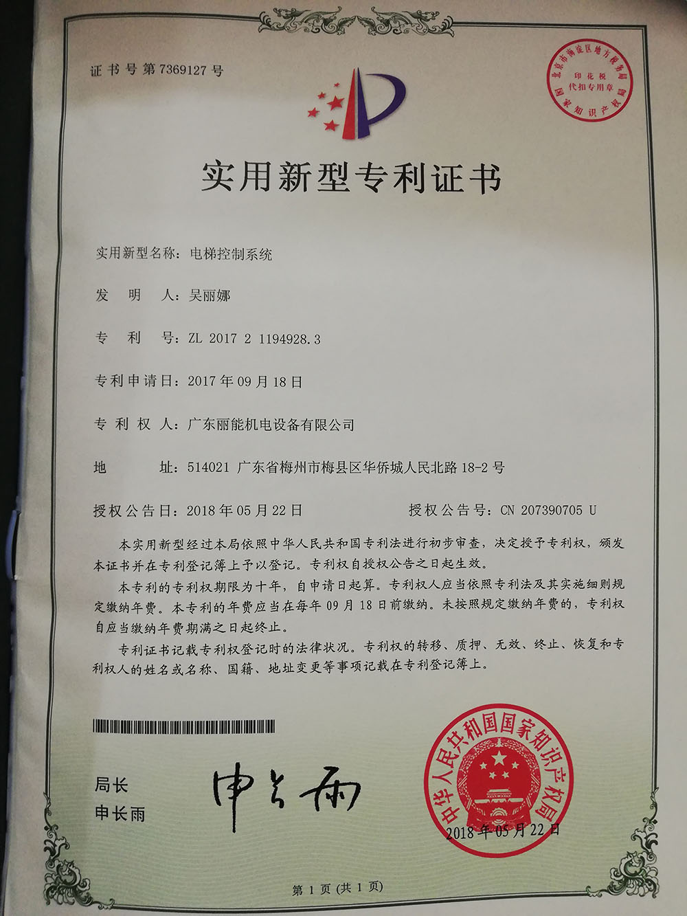 實用新型專利證書(實用新型名稱:電梯控制系統(tǒng) / 專利號:ZL 2017 2 1194928.3)